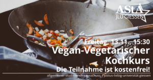 Der Kochkurs findet am 13.11. um 15:30 in der Lehrküche der Uni (Goethestraße 55) statt. Die Teilnahme ist natürlich wie immer kostenfrei. Da der Kochkurs unter strengen Hygieneauflagen stattfinden muss, haben wir nur wenige freie Plätze zu vergeben. Die Anmeldung erfolgt, wie ihr aus sicherlich aus vielen Seminaren gewohnt seid, nach dem „Windhundprinzip“ (First Come First Serve). Wer sich also als erstes bei uns meldet, ist dabei. Doch Achtung: Anmeldungen nehmen wir erst ab Montag, dem 26.10. ab 08:00 per Mail an oekologie@asta-giessen.de entgegen.