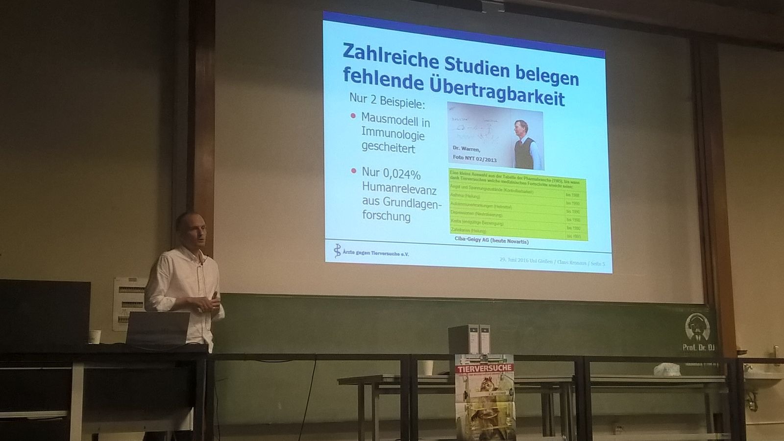 In Zusammenarbeit mit der Tierrechtsgruppe Gießen hat der AStA am 29. Juni einen Informationsabend zum Thema Tierversuche veranstaltet. Der Titel des Abends war „Tierversuche: unnötiges Leid, medizinisches Risiko oder wissenschaftiche Erkenntnise?“. Als Referent war Claus Kronaus, Geschäftsführer des Vereins Ärzte gegen Tierversuche, zu Gast, der den Besuchern einen ausführlichen Überblick über das Thema verschaffen konnte.