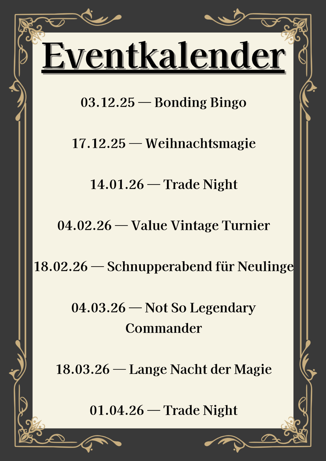 Commander ist bei uns das beliebteste Format – perfekt für gesellige Runden mit spektakulären Spielzügen! Lust auf Abwechslung? Manchmal gibt’s auch Pauper, Standard oder andere Formate – je nachdem, ob sich Leute finden, die Bock drauf haben. Eine offene Atmosphäre, in der du spielen, fachsimpeln, tauschen und neue Leute kennenlernen kannst.