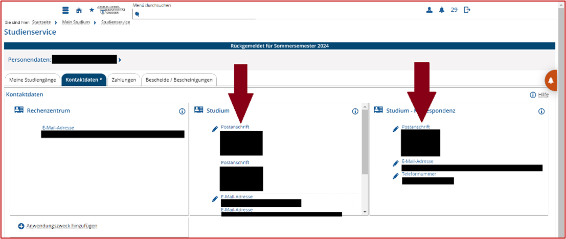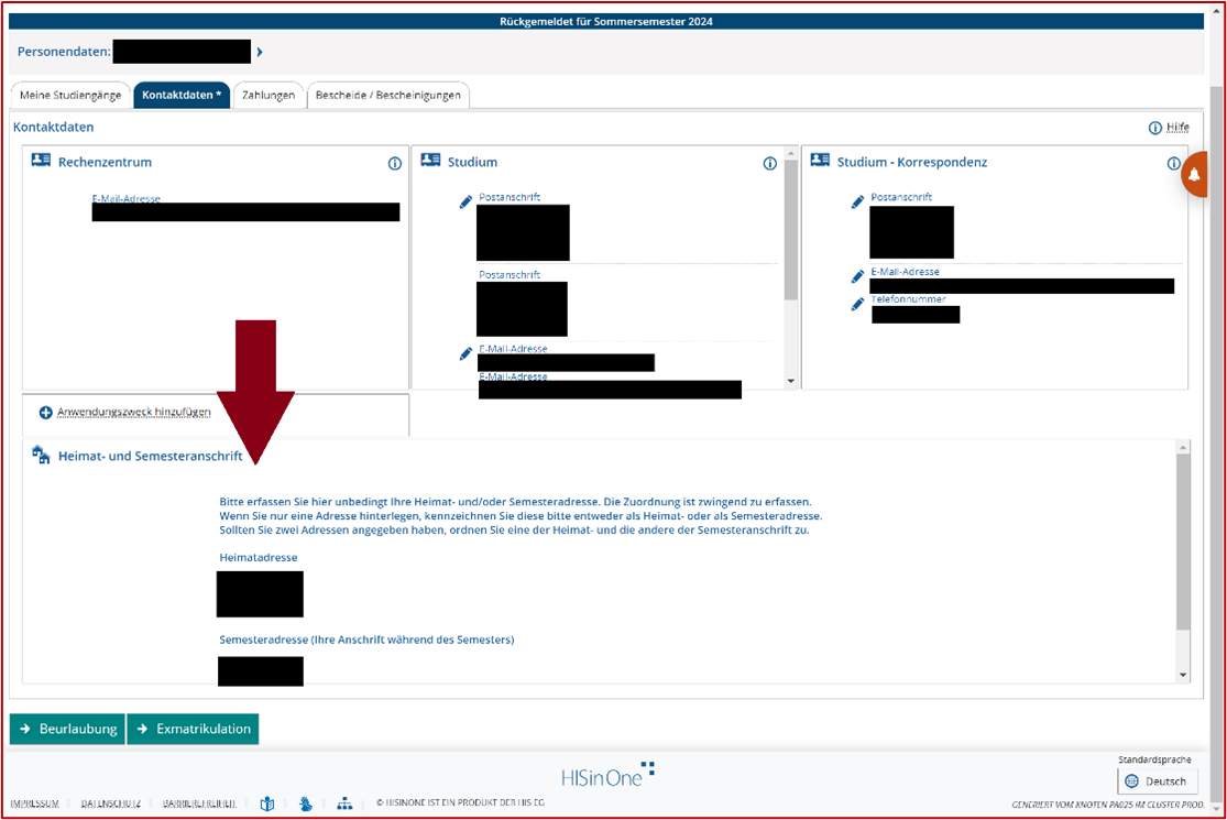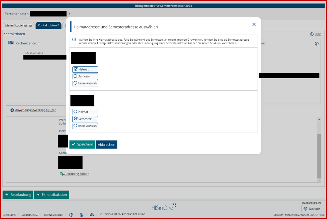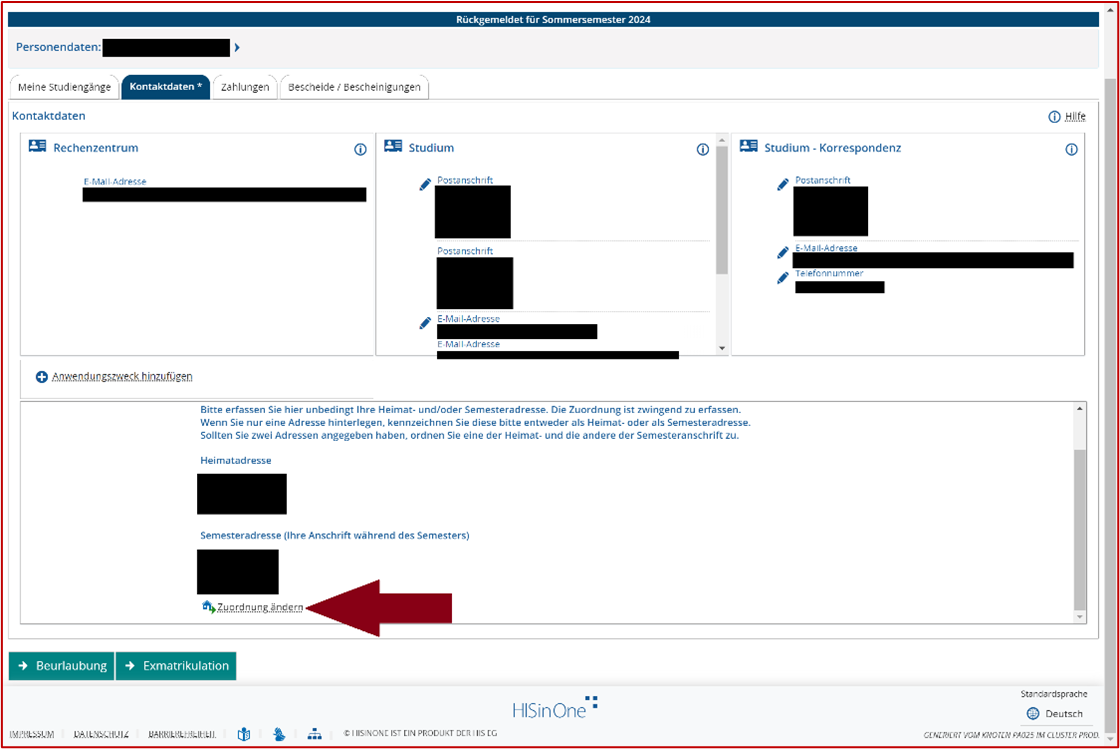 6. Wähle nun im Feld „Heimat- und Semesteranschrift“ die Option „Zuordnung ändern“ aus.