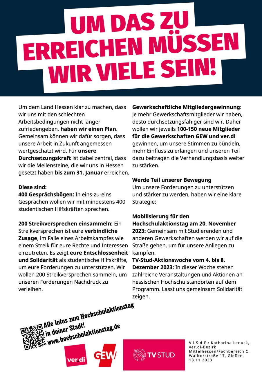 Um diesen Forderungen Nachdruck zu verleihen, finden vom 4.-6. Dezember an den hessischen Hochschulstandorten Kassel, Marburg, Gießen, Frankfurt und Darmstadt Aktionen und Veranstaltungen statt.