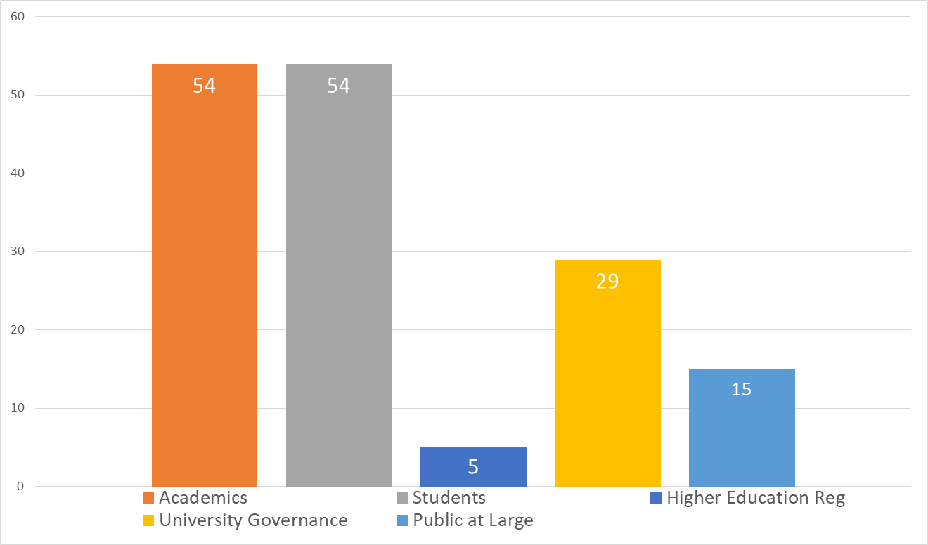 a) Academics b)students c)university structures d)Higher ed regulatory authorities e)Public at large